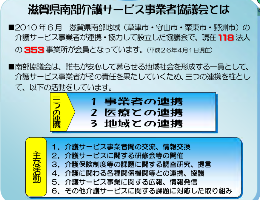 滋賀県南部介護サービス事業者協議会という団体があります。草津・栗東・守山・野洲の4つの市が滋賀県の「南部」としての圏域で括られていて、そのエリアにおける介護サービスの事業者が会員となり、事業者・医療・地域との連携を発展させています。