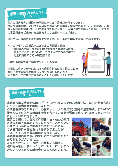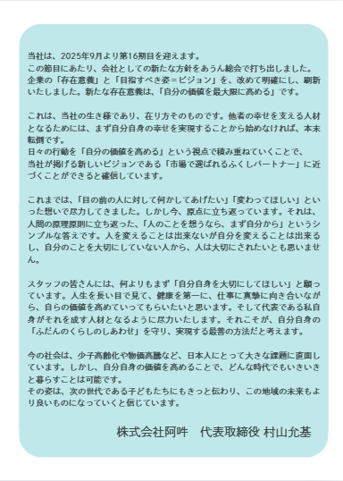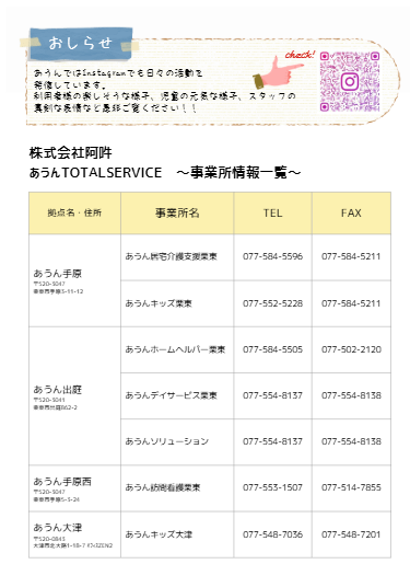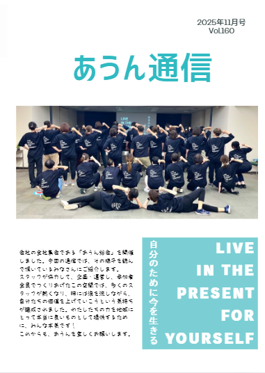 NEWS お知らせ 2025.10.24 あうん通信vol.160 あうんのホームページへアクセスして頂き、ありがとうございます。 新しくあうん通信が発行されました。どうぞ、ご確認ください。 今後とも、どうぞ宜しくお願いします。 PREV ALL ブログ BLOG 感染症予防の注意喚起! 2025.10.22 事例を通して学ぶ 2025.10.15 事業所の美化点検を実施しました。 2025.10.08 あうん総会2025 2025.09.25 「やるべきこと」「できること」 2025.09.22 ヒヤリハットを最大限活用する 2025.09.16 話を聞くコツ 2025.09.11 事業理念「人が役立ち、人が守られる環境をつくる」について 2025.08.31 あうんブログ お知らせ NEWS 2025.10.24 あうん通信vol.160 2025.09.26 あうん通信vol.159 2025.08.25 あうん通信vol.158 2025.07.28 あうん通信vol.157 お知らせ 採用情報 RECRUIT 滋賀の地域に住む人たちの暮らしを 一緒に支えていきませんか? 採用情報 Contact us お気軽にお問い合せください。 当社へのお問い合せはお問い合せフォームもしくはお電話で承っております。お気軽にお問い合せください。 お電話でのお問い合せ 077-516-6300 お問い合せフォーム