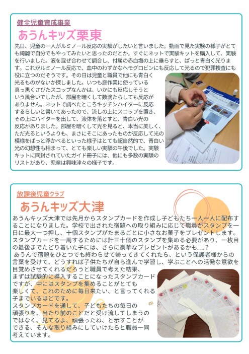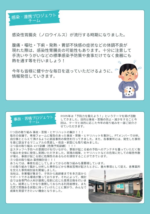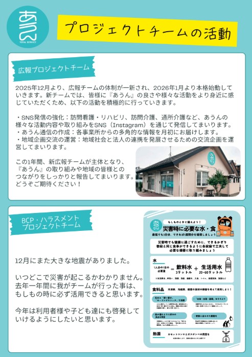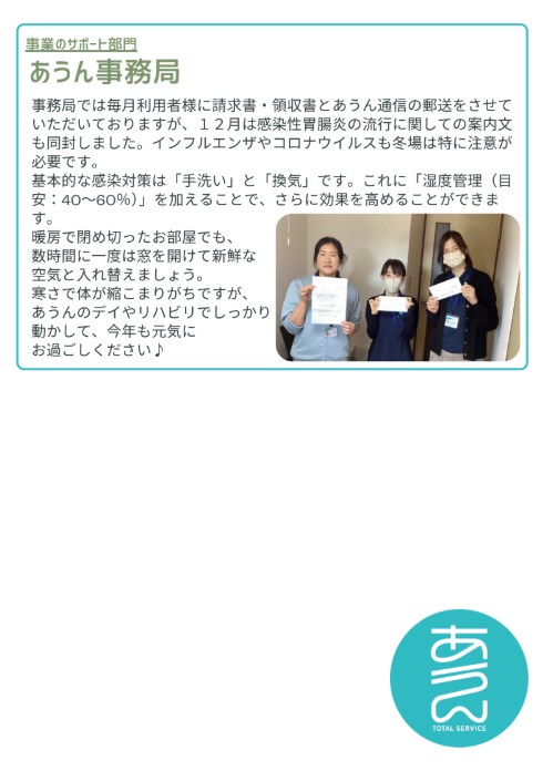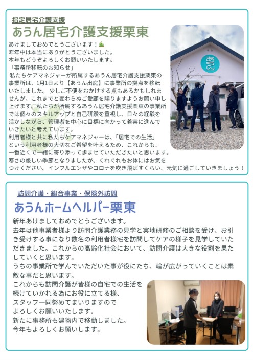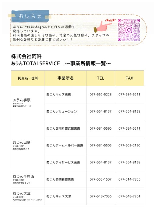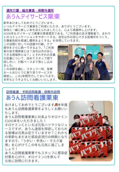 NEWS お知らせ 2025.12.25 あうん通信vol.162 あうんのホームページへアクセスして頂き、ありがとうございます。 新しくあうん通信が発行されました。どうぞ、ご確認ください。 今後とも、どうぞ宜しくお願いします。 PREV ALL ブログ BLOG 災害に備えた1年として 2025.12.23 あうんの良さ拡散部隊 2025.12.19 事故苦情のプロジェクトチームとしての振返り 2025.12.10 地域清掃活動を行いました 2025.12.05 BCP見直しました! 2025.11.19 いざというときの命を救うための訓練 2025.11.13 消火訓練・避難訓練を実施しました。 2025.11.07 感染症予防の注意喚起! 2025.10.22 あうんブログ お知らせ NEWS 2025.12.25 あうん通信vol.162 2025.11.28 あうん通信vol.161 2025.10.24 あうん通信vol.160 2025.09.26 あうん通信vol.159 お知らせ 採用情報 RECRUIT 滋賀の地域に住む人たちの暮らしを 一緒に支えていきませんか? 採用情報 Contact us お気軽にお問い合せください。 当社へのお問い合せはお問い合せフォームもしくはお電話で承っております。お気軽にお問い合せください。 お電話でのお問い合せ 077-516-6300 お問い合せフォーム