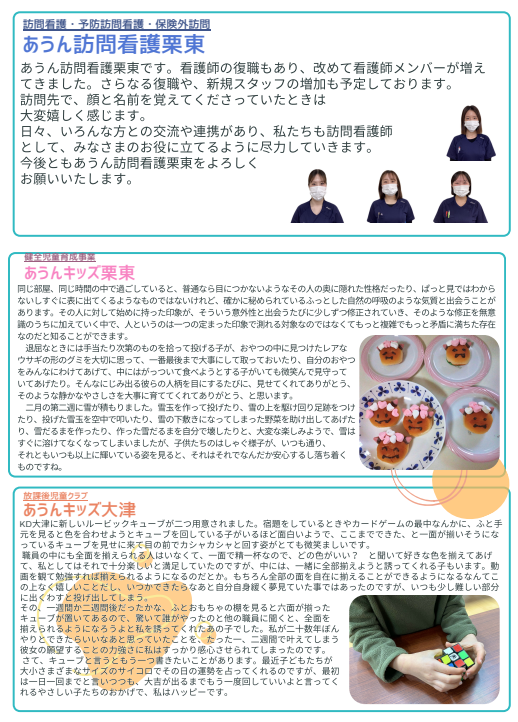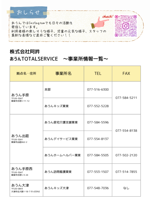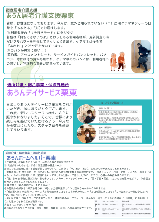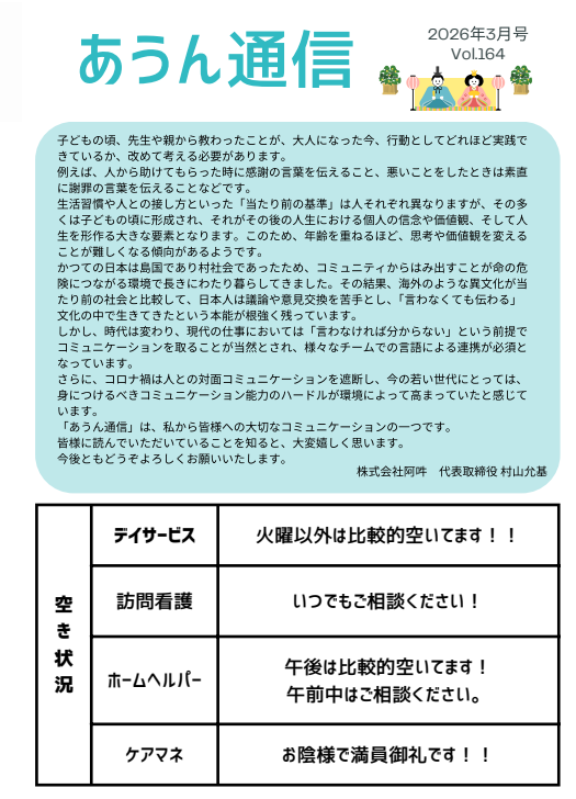 NEWS お知らせ 2026.02.26 あうん通信vol.164 あうんのホームページへアクセスして頂き、ありがとうございます。 新しくあうん通信が発行されました。どうぞ、ご確認ください。 今後とも、どうぞ宜しくお願いします。 PREV ALL ブログ BLOG 栗東市の栗東市地域包括支援センター・地域密着型サービス運営協議会・認知症初期集中支援事業の会議でした。 2026.02.27 営業についての研修でした。 2026.02.24 セルフトークがネガティブだと夢は叶わない。 2026.02.23 将来のために勉強ができる環境をつくりたいと思います。 2026.02.22 求人のお問い合わせをたくさんいただきました。 2026.02.21 企業の管理者会議にお邪魔しました。 2026.02.21 未来の子どものために、社内で寄付が集まっています。 2026.02.19 安全運転管理者講習 2026.02.19 あうんブログ お知らせ NEWS 2026.02.26 あうん通信vol.164 2026.01.26 あうん通信vol.163 2025.12.25 あうん通信vol.162 2025.11.28 あうん通信vol.161 お知らせ 採用情報 RECRUIT 滋賀の地域に住む人たちの暮らしを 一緒に支えていきませんか? 採用情報 Contact us お気軽にお問い合せください。 当社へのお問い合せはお問い合せフォームもしくはお電話で承っております。お気軽にお問い合せください。 お電話でのお問い合せ 077-516-6300 お問い合せフォーム